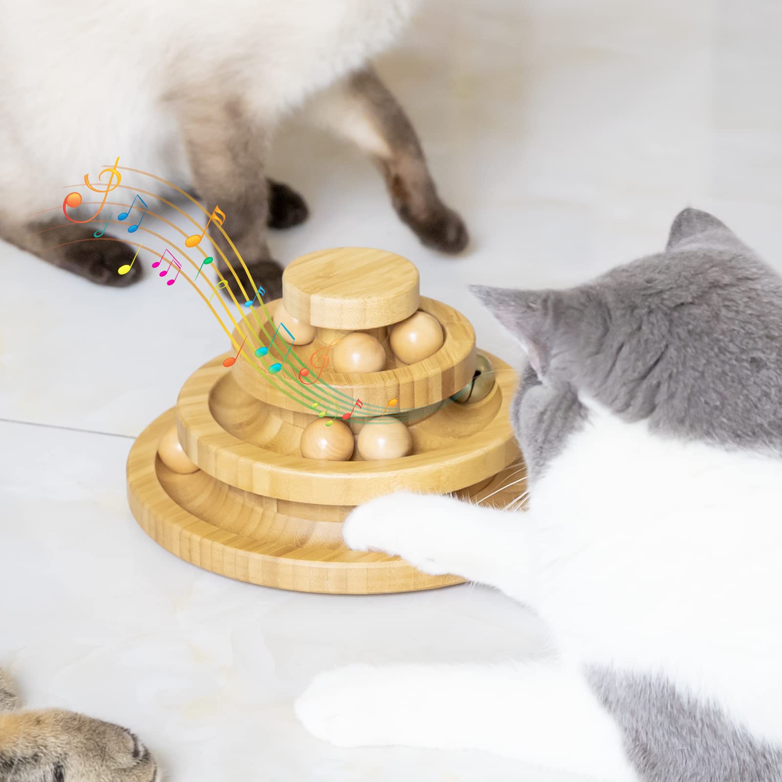 Gatos atraer, El juguete para mascotas de camuflaje te ofrece un juguete de 3 niveles de pista y pelota con el que podrás entretener y mantener entretenidos incluso a los gatos más difíciles durante horas. Tu amigo de los gatos nunca se aburrirá cuando intente levantar las tres bolas de prisión coloridas de su torre. La bola de madera se ajusta al riel puede estimular la fuerte curiosidad del gato y no se cae fácilmente y no se deforma por el gato.