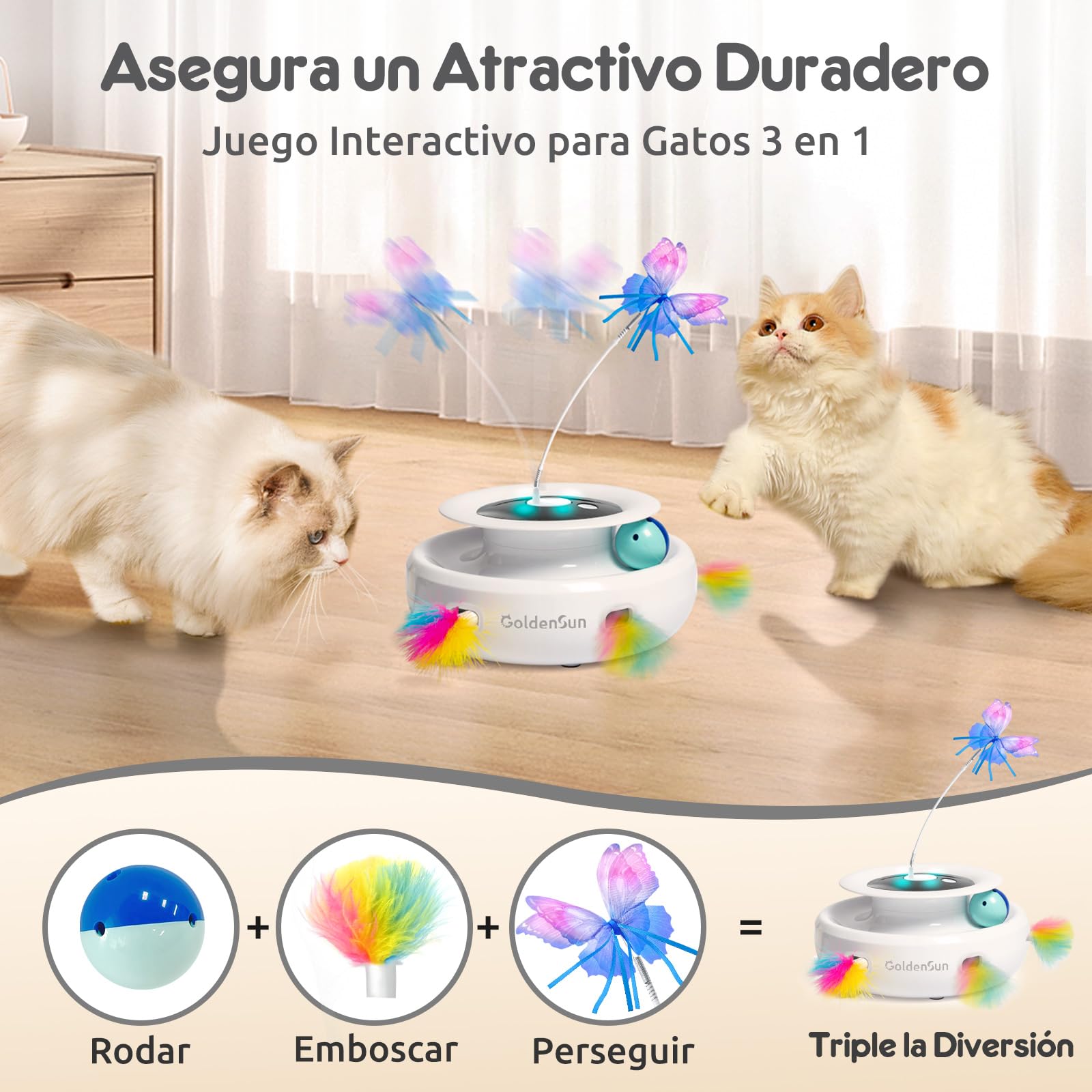 🎁 3 en 1, la mejor relación calidad-precio Los juguetes interactivos para gatos GoldenSun estimulan los instintos naturales de los gatos: perseguir, saltar y emboscar. Las bolas giratorias estimulan los sentidos de tu gato. El sonido aleatorio de las plumas estimula el instinto de caza. Y la mariposa giratoria anima a perseguir. ¡Evita que tu gato se aburra!
