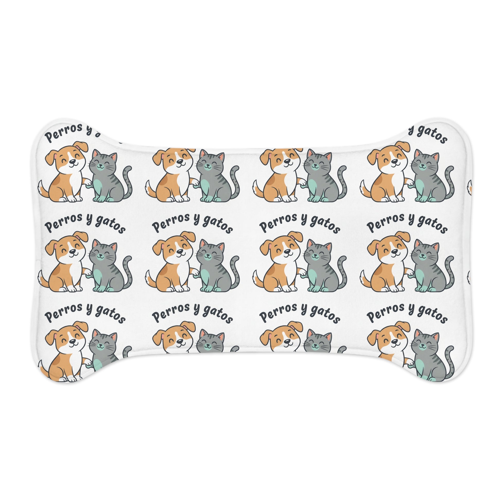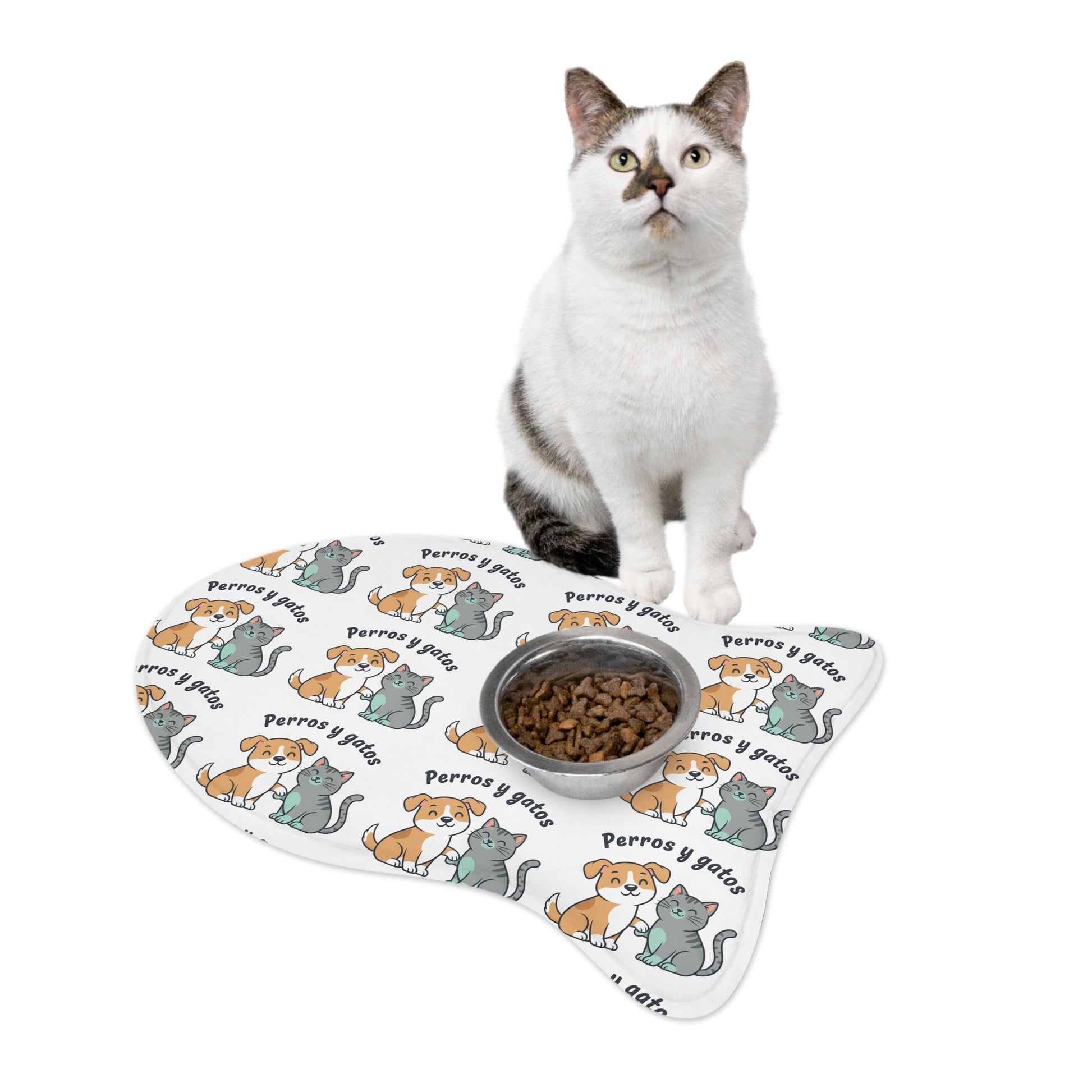A cozy, spill-catcher feeding mat designed to bring a little joy to mealtime. Soft, plush polyester on top cushions bowls and small paws, while a memory foam core quietly absorbs drips and keeps the surface smooth. The anti-slip backing holds the mat steady on tile or hardwood so bowls stay put as pets eat. The repeat illustration of a friendly dog and cat with the phrase “Perros y gatos” adds a warm, playful touch that brightens any feeding corner. Lightweight and easy to wipe or spot-clean, it fits naturally into daily routines and makes cleanup calmer and quicker.